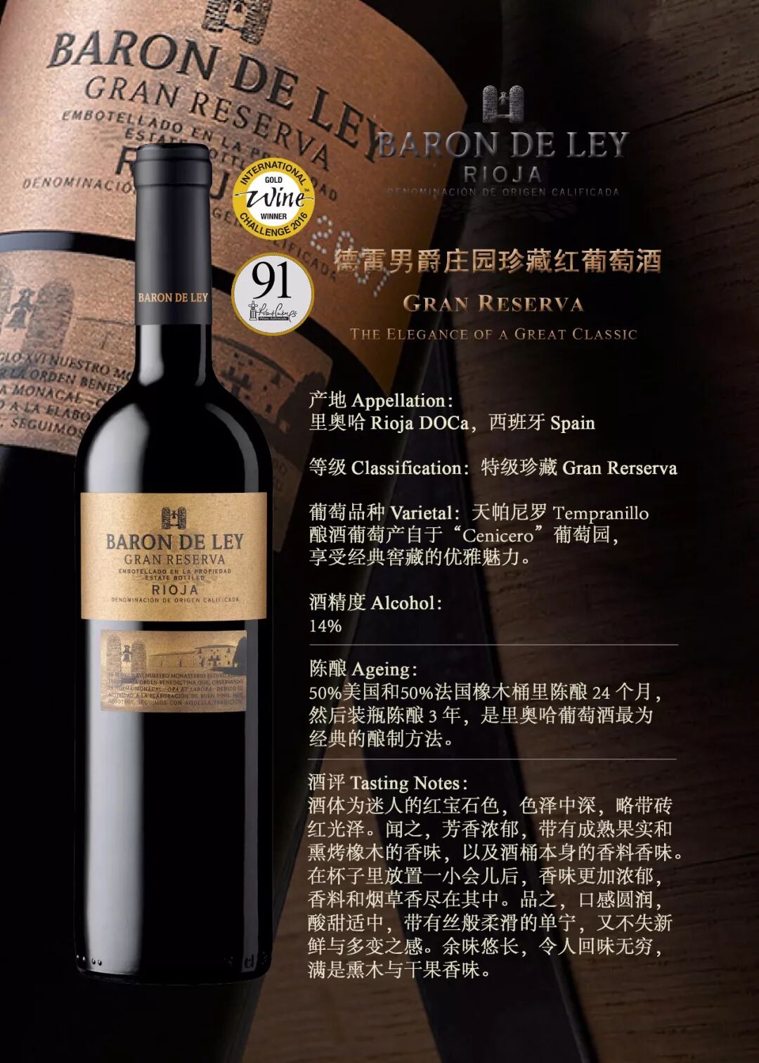 最具品质保证 德雷男爵庄园珍藏红葡萄酒 德雷男爵酒庄的特级珍藏在里奥哈地区一直以品质稳定著称,也是酒庄引以为傲的一个级别。